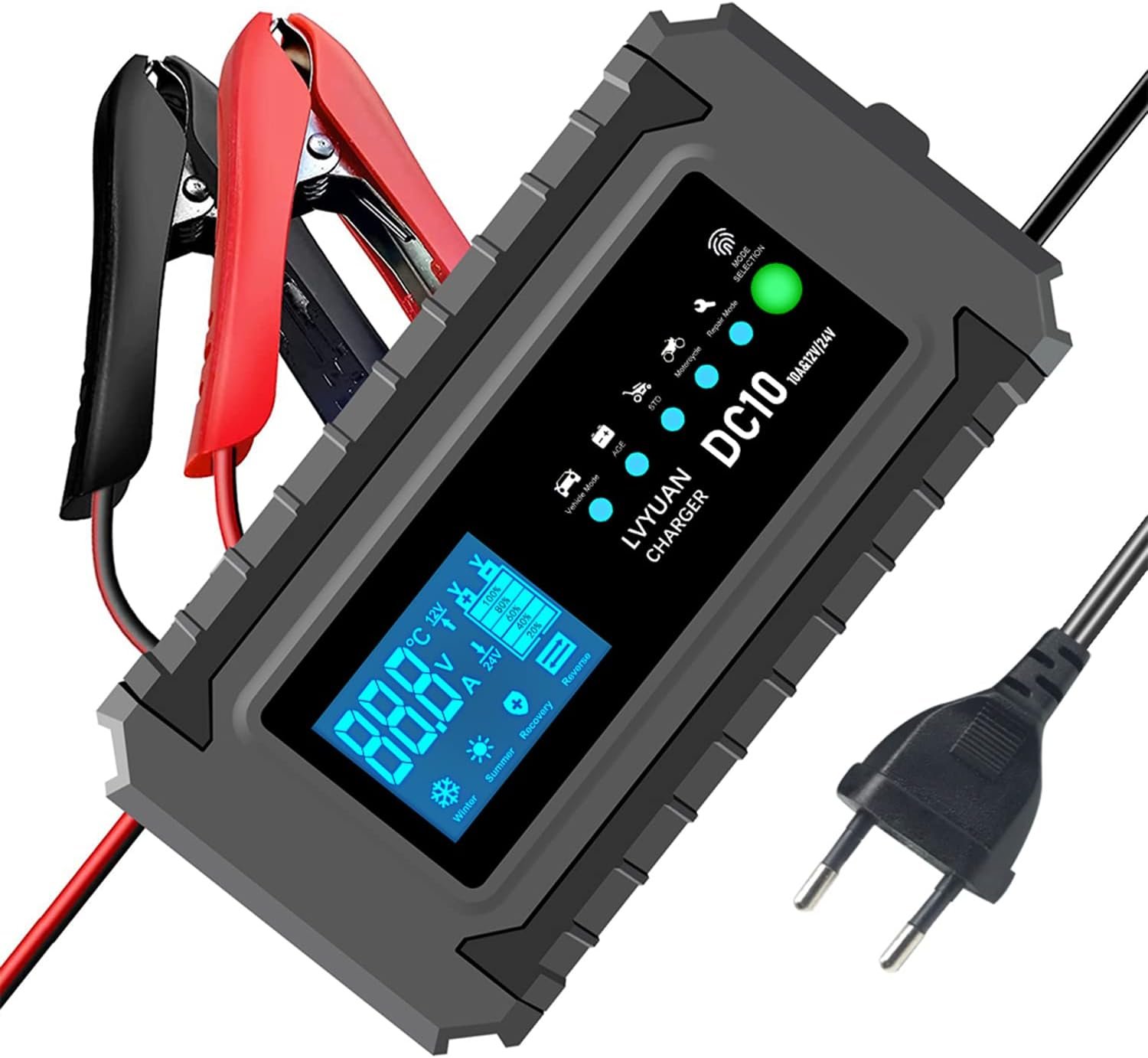 Cargador de Baterias Coches Moto 10A 12V/24V Cargador de Batería Inteligente Automático LCD y Función Invierno y Verano Múltiples Protecciones para Baterías de Auto Moto Plomo-ácido/AGM/EFB/Gel