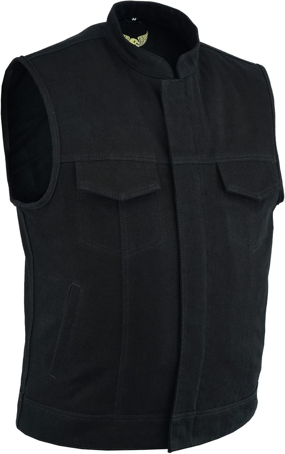 Leatherick Chaleco de motociclista de mezclilla pesada para hombre con interior transpirable, chaleco de motociclismo de doble cierre con bolsillos de transporte ocultos